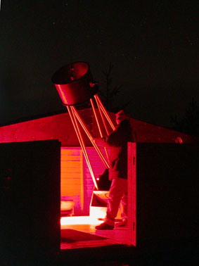 | The half meter Dobsonian being readied for a nights viewing. Pictured here is the half meter in its roll off roof observatory. The observatory provides a comfortable environment from which to view the night sky. Although a large telescope it is very easy to use. With its NGC Max computer and Telrad sight it is very easy to find objects and there are a variety of platforms and ladders to provide easy access to the eyepiece. Stephans' quintet? No problem! Spiral arms on M51 or M33? No need for
