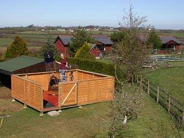 | Another picture of the observatory and half meter Dobsonian. This picture shows an observing platform in use. In the background is the accommodation and swimming pool. Both pictures also show the attractive grounds. | ![]() |