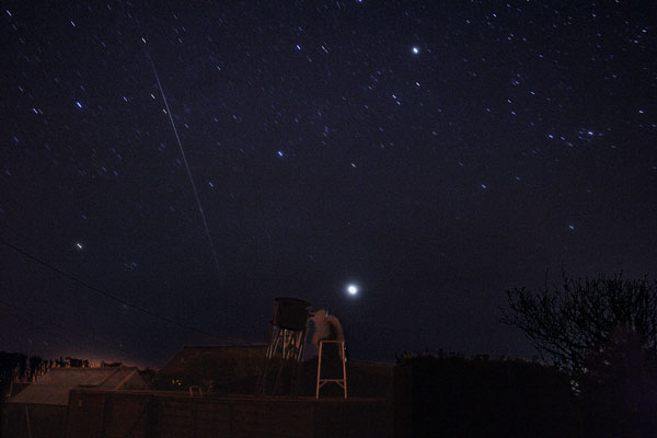 | April 2007.The ISS rises from the west as Venus, setting, shines like the Moon over the observers shoulder. This striking time exposure was taken as guest, Phil Moore, observed the spring sky with its' many galaxies. |